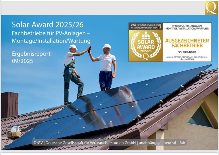 am 30. September wurde die Studie «Solar-Award 2025/26» veröffentlicht, die die Deutsche Gesellschaft für Verbraucherstudien (DtGV) in diesem Jahr erstmalig umgesetzt hat (Studienlink: dtgv.de/12965). Im Fokus standen vier zentrale Bereiche der Energiewende – u.a. auch das Segment „Fachbetriebe für PV-Anlagen (Montage/Installation/Wartung)“.