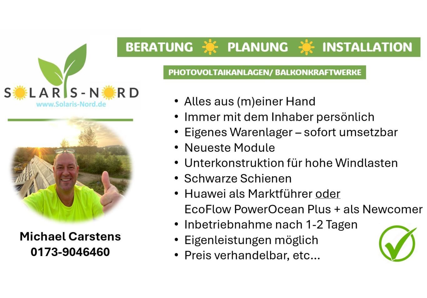 Michael Carstens ist Inhaber von Solaris-Nord. Das bedeutet für Sie, Sie haben den direkten Kontakt zum Inhaber... daher bekommen Sie eine schnelle und sehr professionelle Beratung, Planung, Projektierung, sehr guten Preis durch diese persönliche Struktur, schnelle Entscheidungen, schnelle und professionelle Umsetzung, Service, außerdem zahlen Sie bei uns pro Modul und nicht nach kWp - das komplette Paket aus einer Hand.