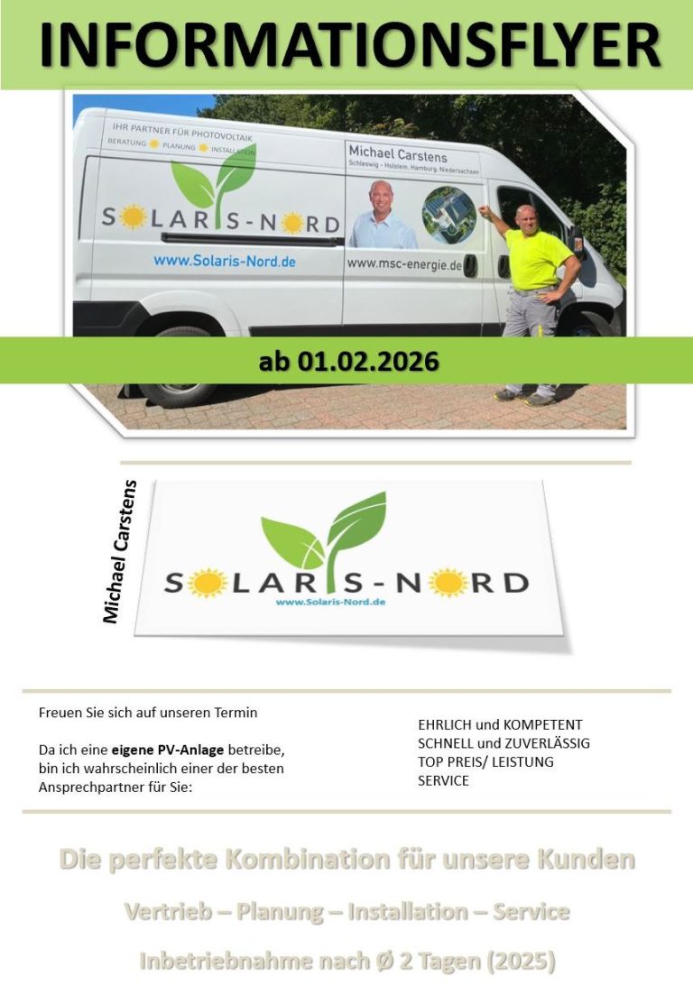 Michael Carstens ist Inhaber von Solaris-Nord. Das bedeutet für Sie, Sie haben den direkten Kontakt zum Inhaber... daher bekommen Sie eine schnelle und sehr professionelle Beratung, Planung, Projektierung, sehr guten Preis durch diese persönliche Struktur, schnelle Entscheidungen, schnelle und professionelle Umsetzung, Service, außerdem zahlen Sie bei uns pro Modul und nicht nach kWp - das komplette Paket aus einer Hand.